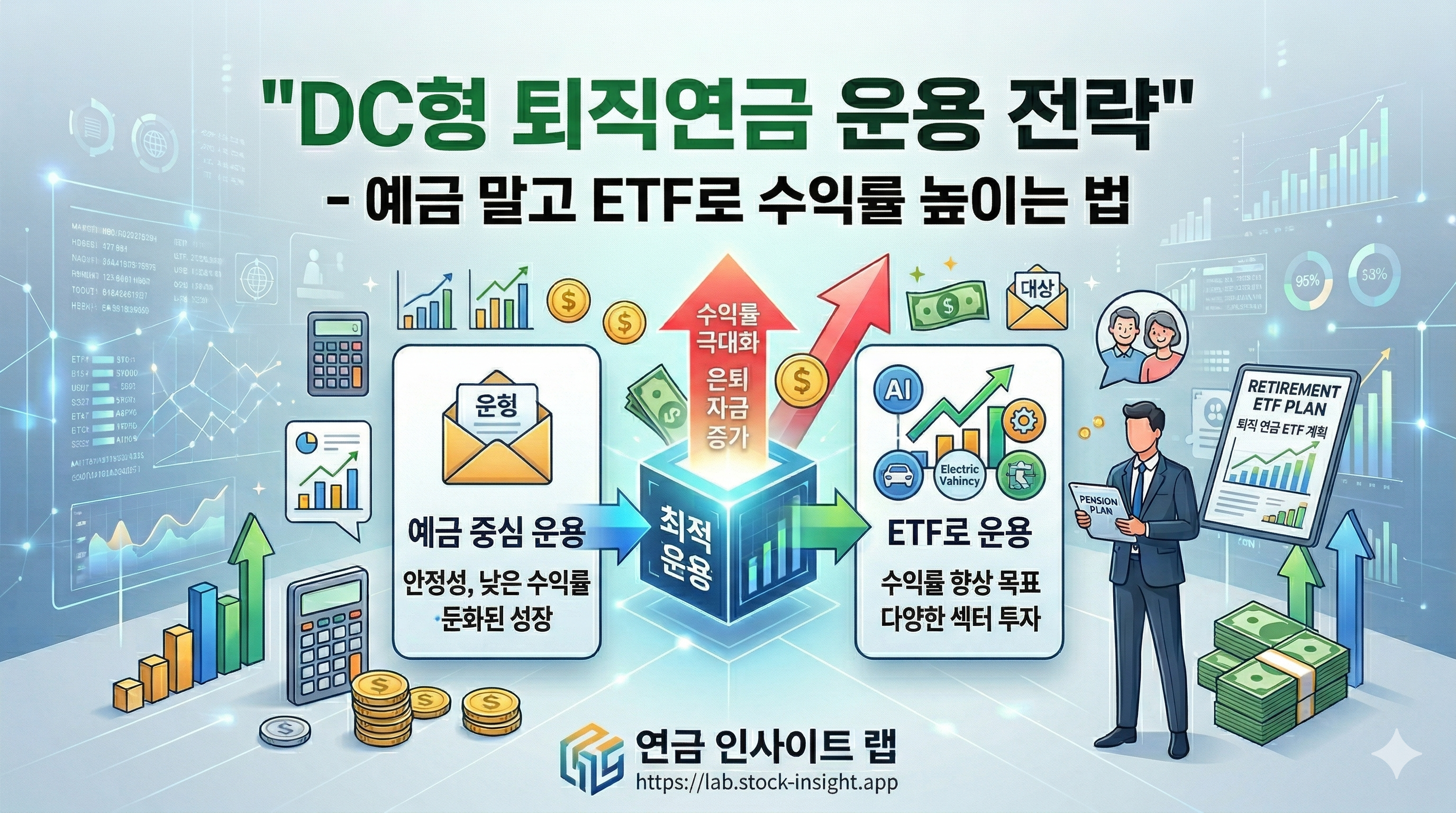 | 한국 직장인의 DC형 퇴직연금 평균 수익률은 연 2~3%에 불과합니다. 원인은 단 하나 — 대부분이 원리금 보장 예금에 방치하고 있기 때문입니다. DC형 퇴직연금은 위험자산 70%까지 ETF에 투자할 수 있습니다. 같은 납입액으로 S&P500 ETF를 운용하면 30년 후 수령액이 2~3배 차이 납니다. 이 글에서 DB형·DC형 차이, DC형에서 투자 가능한 ETF 목록, 최적 포트폴리오 구성, 리밸런싱 전략을 완벽 정리합니다. |