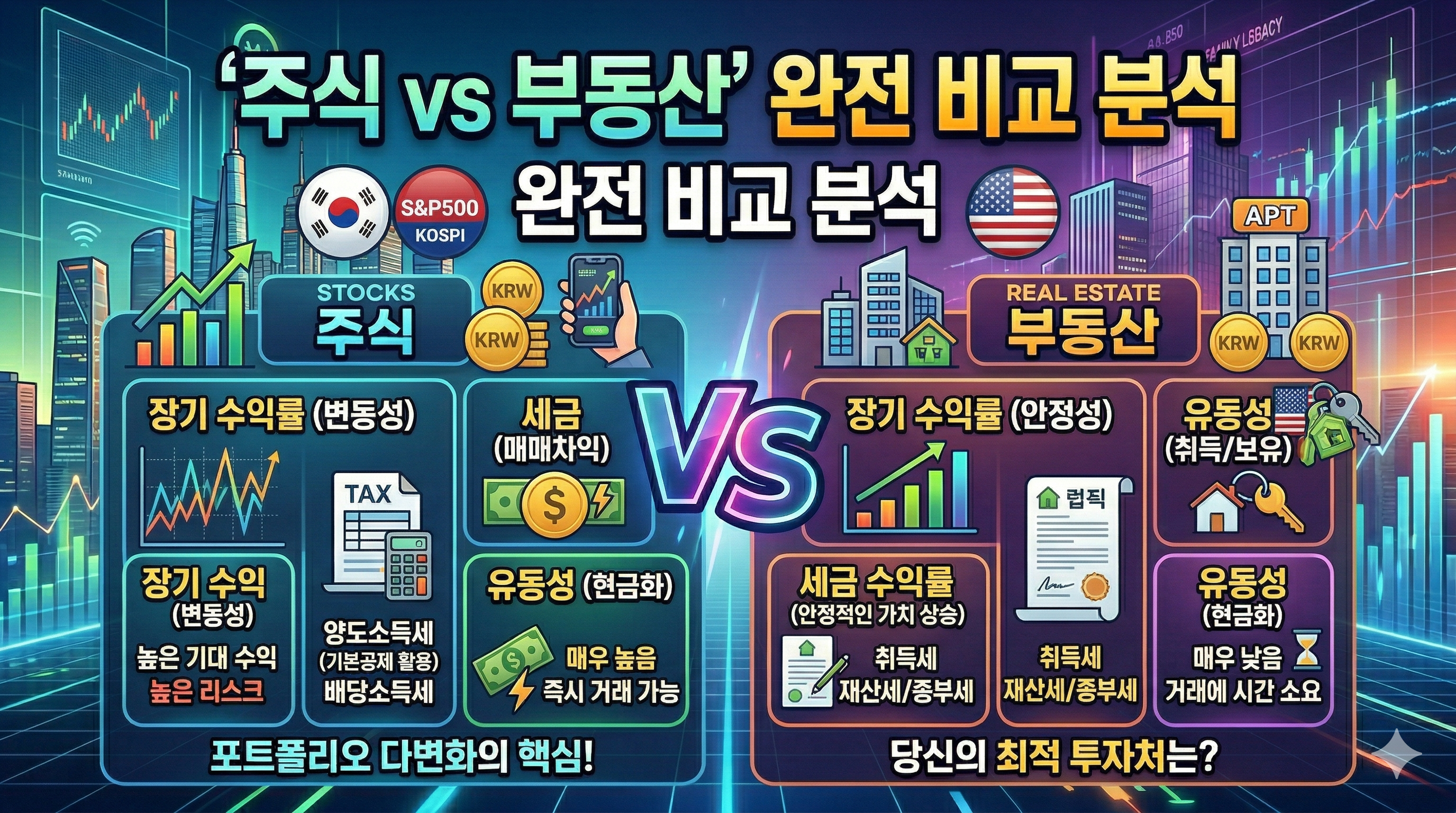 | 핵심 요약 순수 수익률 = 주식(S&P500 연 10%) > 부동산(연 5~7%) — 장기 복리는 주식 우위 레버리지 포함 = 부동산 LTV 활용 시 수익 2~3배 — 조건부 역전 가능 세금·유동성 = 주식이 압도적 유리 — 취득세·종부세·양도세 없이 즉시 매매 최적 전략 = 실거주 1채 + 주식(ETF) + 리츠(REITs) 3각 구성으로 두 자산 장점 흡수 |