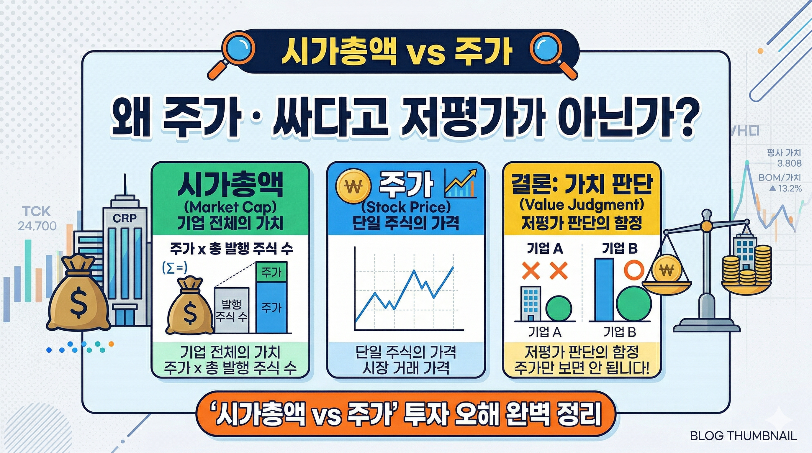 StockInsight Lab · 주식 기초 시리즈시가총액 vs 주가왜 주가가 싸다고 저평가가 아닌가?2026.03 · 읽는 시간 약 5분 '주가가 3,000원이니까 싸겠지?' — 이 생각이 위험한 이유많은 초보 투자자들이 주가가 낮으면 '저렴한 주식'이라고 오해합니다.하지만 주가는 단순한 거래 단위일 뿐, 기업의 실제 가치와는 직접적인 관련이 없습니다.기업의 진짜 몸값은 '시가총액'으로 봐야 합니다. 오늘 이 개념을 완벽히 정리해 드립니다. 01 주가란 무엇인가? 📌 정의주가 = 주식 1주를 사고팔 때의 거래 가격 주가는 매수·매도 세력의 수급에 의해 실시간으로 결정됩니다.주가가 높다고 비싼 기업, 낮다고 싼 기업이 아닙니다. 주가는 그냥 '1주의 가격 태그'일 뿐입니다. 💡 쉬운 비..